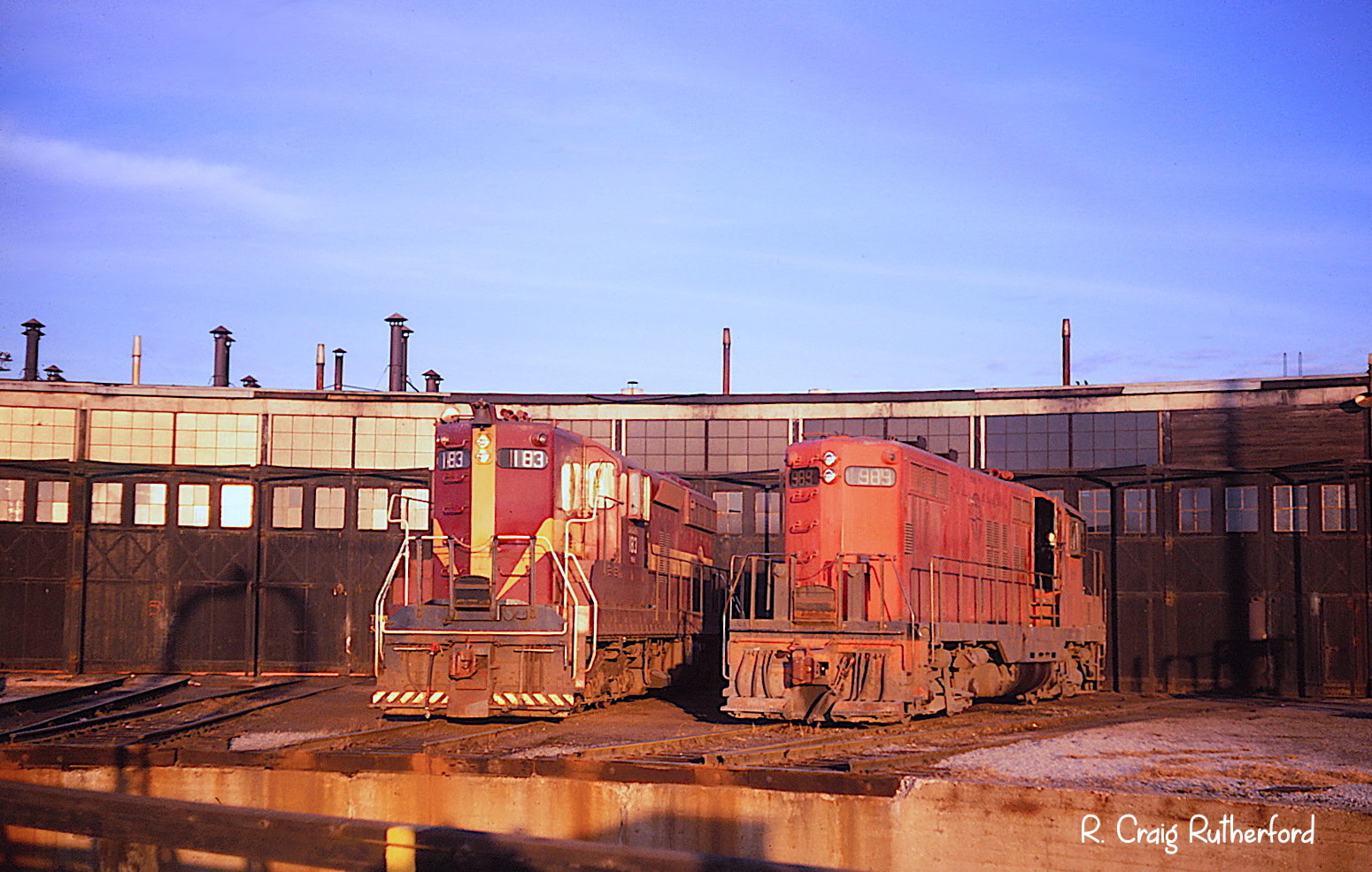 New arrival DM&IR #183 waits outside DT&I's Flat Rock roundhouse in late November 1964. It's not likely the six-axle loco from Minnesota will see action hauling freights between Michigan and Southern Ohio, during the winter lease. Instead it will work the yard and make transfer runs between to Windsor, ONT. |