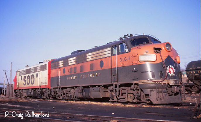 The Great Northern F7A #316A was one of sevral F-units that the railroad had assigned to the Mesabi Division hauling ore and taconite. It was leased to the SOO during the winter of 1967/68 when the docks at Allouez Bay (Superior), Wisconsin were shut down. (30 March 1968 photo at Sault Ste. Marie, Michigan) |