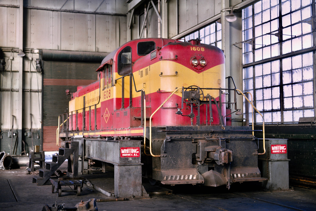The all-Alco Ann Arbor railroad had a good-size diesel shop located in Owosso, Michigan; the multi-bay facility handled most heavy repairs and routine maintenance. Leased four-axle LS&I #1608 occupied one of the bays in this January 1964 image. (Emery Gulash photo / Bruce Mercer collection). |