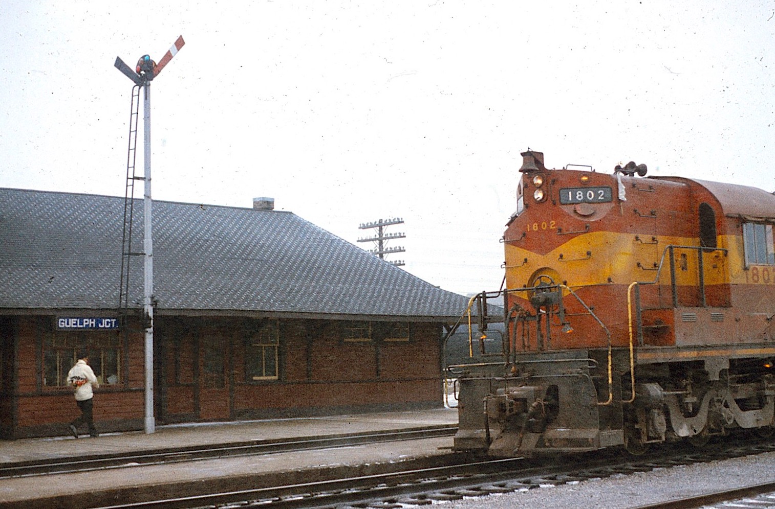 CPR's Guelph Jct. train station southwest of Toronto was built in 1923 to serve the railroad and community. The all-brick, single-story facility had overseen the arrival and departure of passenger and freight trains for more than four decades. By February 1965, it was freight only, but strangers, such as LS&I RSD12 #1802, were still being welcomed to the area. (Doug Wingfield photo) |