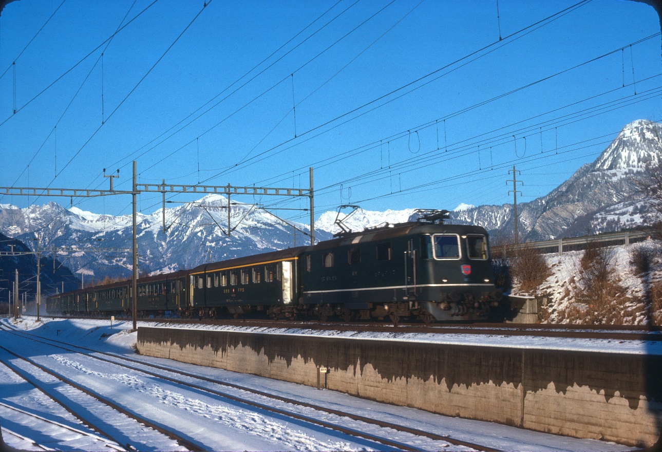 the 11449 arriving in Zurich with a substantial passenger train in tow on January 2, 1978.