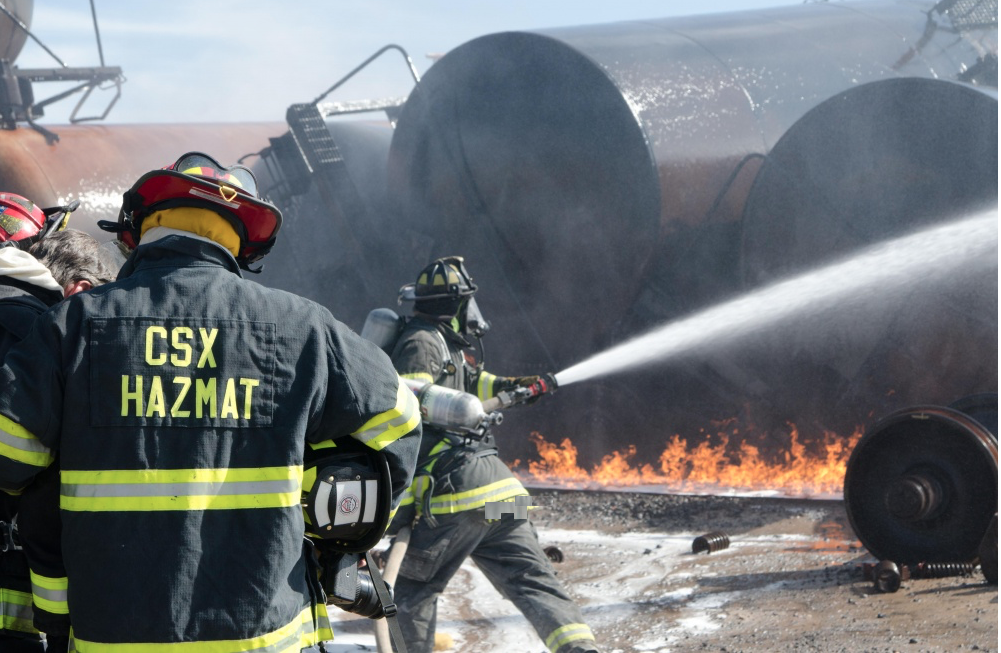 ![]() Hazardous material spill and fire fighter training are important components of TTCI's mission. (Randy Allard photo in October 2014) |