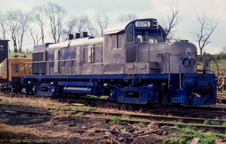 ![]() RS3m #1075 (Alco 80764 b/d 1/55) The 1200-hp #1075 was one of three ex-Missouri Pacific RS3s on the TTI roster that had been re-powered with an EMD V12-567 prime mover (during the early 1960s) and re-number from #4507. (Paris, Kentucky photo in 1985 by Dan Tracy photo / Andy Puch collection). |