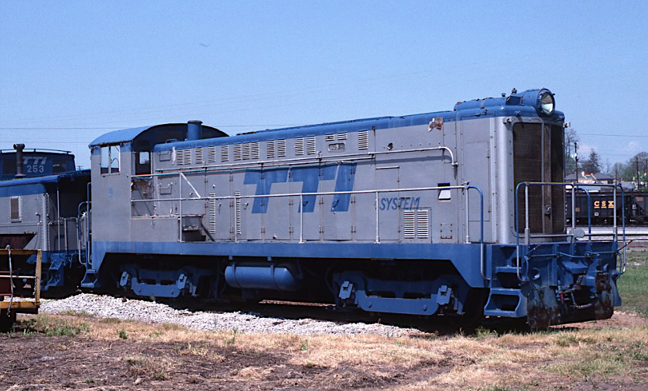 ![]() VO-1000 #9 (BLW 71525 b/d 9/45) The railroad's lone Baldwin was built as U.S. Navy #36 (65-00203). The four-axle switcher worked the Cheatham Naval Supply Center in Virginia for many years, prior to entering service on the TTI ownership. (Bruce Gage photo at Paris, Kentucky on 28 August 1991.) |