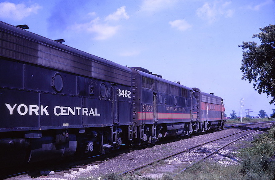 ![]() Baltimore & Ohio 2-10-2 #6114 crosses NYC's 4-track Chicago-Buffalo main in 1957, while s/b on Toledo Terminal. The train is coming from the coal docks at Presque Isle. (Kirk Hise photo; Jim Sankiewicz collection) | ![]() New York Central's NY2 passes Vickers with Alco-built FA2 #1051 in charge on a late Spring 1962 day. The e/b meat train ran daily from the Chicago Stockyards to New York City. (Harry Juday photo) |