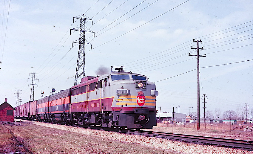 ![]() The date is 18 May 1965 and leased B&LE F7A #717 barrels passed the Oshawa, Ontario station with a good-size westbound CPR manifest. The trailing GP9 is rare southern Ontario visitor. (Doug Hately photo) |