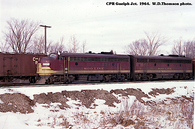 ![]() It was simply a case of "beggars can't be choosers." CPR was sorely short on power and the Union Pacific offered only a group of road weary Alco-built FAs and FBs. While on the UP, the Alcos had developed a lengthy record of road failures. (Doug Wingfield photo in Toronto on 1 February 1964) | ![]() A white-flag CPR extra rolls through Guelph Junction on 2 February 1964. Led by SOO F7A #2224A and F7B #501C, ex-EMD Demo #9053 [11017, 11/49]. The EMD pair wear the maroon and gold dress of original owner Wisconsin Central. (W.D. Thomson photo / Bruce Chapman collection) |