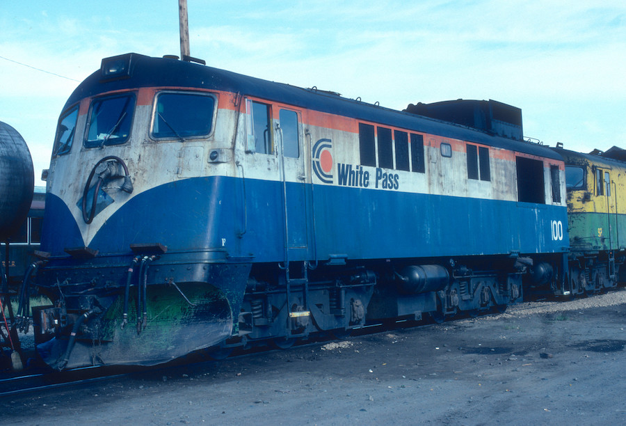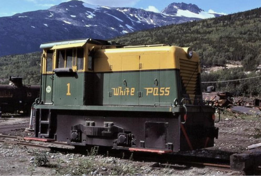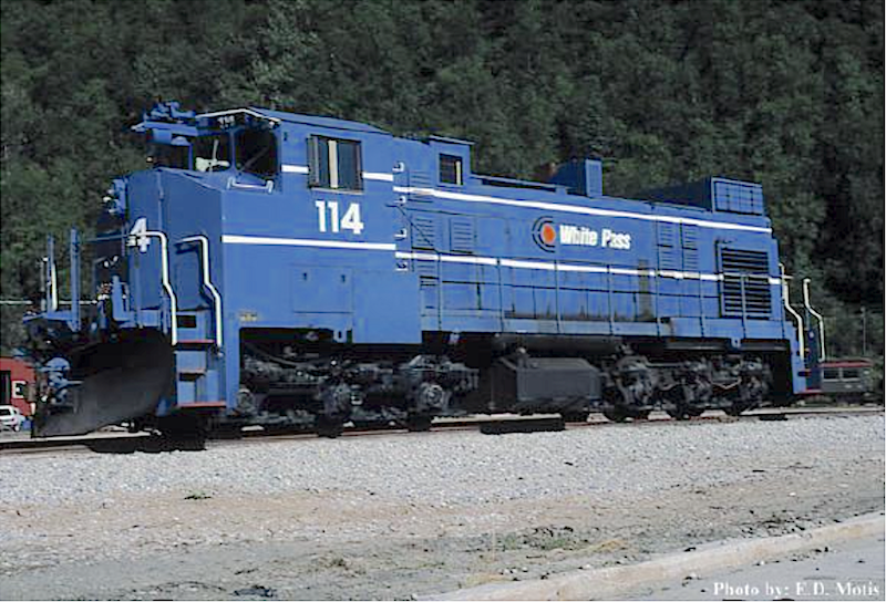 For many years, the White Pass fleet of GEs consisted of eleven six-axle road units (#90-100) which varied in weight from 84 to 86-tons. With the installation of Cummins QSK45L replacement engines during the 2008-2011 timeframe, initial specifications may have changed. Two 25-ton industrial-type switchers, along with a small Plymouth augmented the road units. The most notable GE on the roster was a one-of-a-kind 76-ton, dual-gauge end-cab built for the U.S. Army as #3000. A group of 10 Montreal Locomotive Works-built DL535Es (#101-110) were acquired new in 1969 and constituted the rest of the WP&Y roster for nearly 25 years. The MLWs featured a 1200-hp, 6-cylinder 251 engine designed by Alco, and they resembled a scaled-down version of the mid-1960s proposed (but never built) low-nose Alco Century 620. The acquisition of Bombardier- built DL535E #114 in 1996 was the railroad's final motive power acquisition during the 20th Century. The most recent change in WP&Y motive power occurred during 2020 with the addition of six E3000CC-DC which were developed by National Railway Equipment. The 2500-hp newcomers wore a dip-black livery with white lettering and a large red waist band. A recent report suggests that one or more of the NREX locos were repainted into the standard green and yellow scheme. New: 1 August 2023