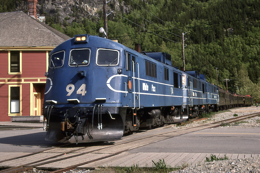 ![]() WP&Y's newest power was delivered during 2020 in a very uncharacteristic black with white stripes livery. After a full year of operation, the NRE E3000CCs were repainted into the railroad's traditional green and gold. The #3002 with one of several daily excursion trains departs Skagway in July 2023. (Bill Rettberg photo)